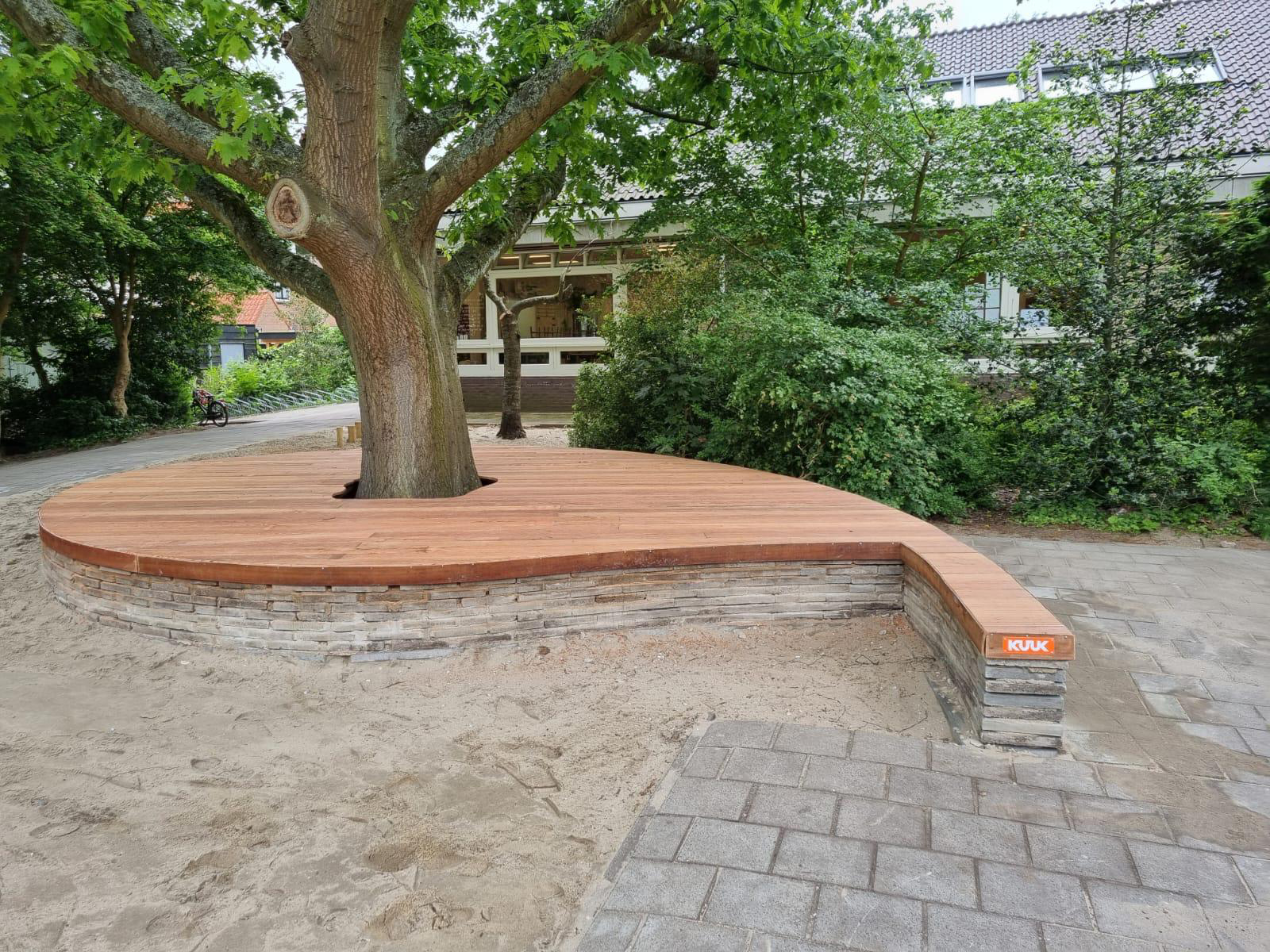 “We hebben sowieso een fijne buitenruimte, groot en groen, met ook een flink stuk gras. Dankzij de samenwerking met aannemersbedrijf Kuuk en met Sanne is ons schoolplein nog groener en uitdagender geworden. Er zijn 500 tegels uitgehaald waarvoor duinzand in de plaats is gekomen. Die tegels zijn hergebruikt en, in combinatie met hout, omgevormd tot een slingerbank en een buitentheater. De aanleg is gestart in de meivakantie en heeft in totaal drie weken geduurd. In het najaar wordt de beplanting aangelegd.”