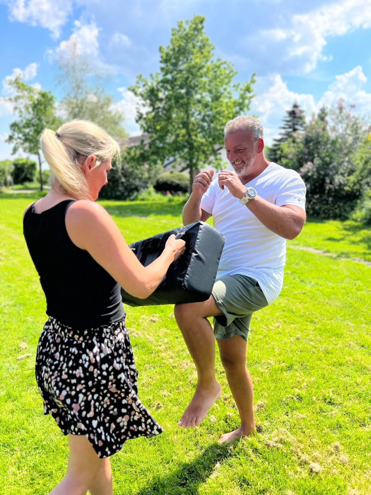 Na de tips was het tijd voor de praktijk en konden onze bewonersbegeleiders oefenen in zelfverdediging. Rianne: “Het was natuurlijk komisch om je collega’s fanatiek knietjes te zien geven tegen kussens. Zelfs onze directeur Jan deed mee. Ik vond het heel fijn om dit met elkaar te kunnen doen, het was ludiek en verbindend tegelijk. Daarna hebben we er nog vaak om moeten lachen, bijvoorbeeld toen een vrouwelijke collega opmerkte dat ze de opgedane technieken thuis ook had toegepast en dat dat haar niet in dank werd afgenomen.”